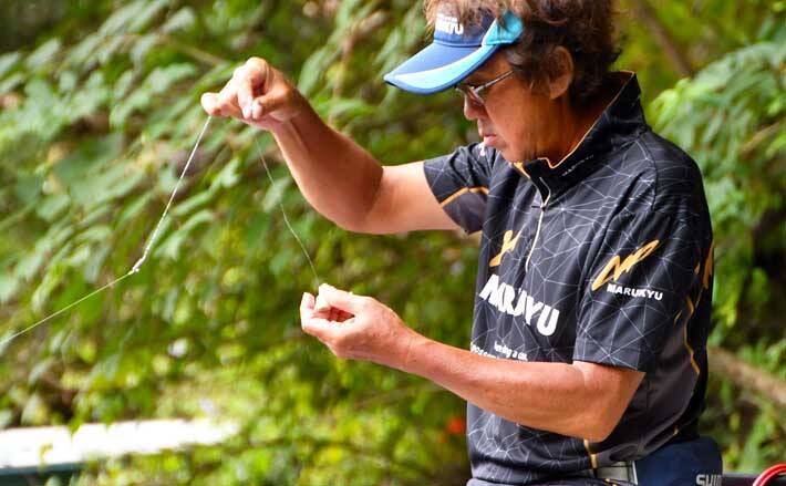 伊藤 さとし「たとえば数分で吸水をやめたとして、そのエサを触ってみるとかなりベチョッとして軟らかいはずだよ。でもまあいいかって、そこから練りを加える。でもなかなかまとまらないから、まとまるまで練ってしまう。でも練り込んでいる間にも吸水していくわけだから、ハリ付けできる程度まで練ってしまうとあとで余計なネバリが出過ぎてしまうんだよね。