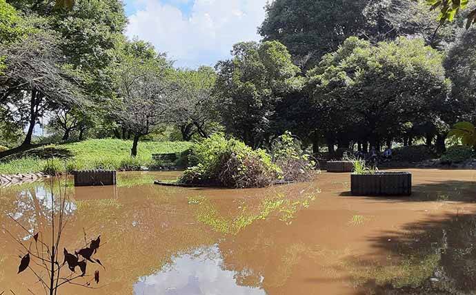 朝6時過ぎに現地到着となり公園内の池を見渡すが、どうやら私が1番乗りのようだ。まずは釣りやすそうな場所を絞り、釣座を設置する。水深もごく浅いので、狙いタナとしてはウキ下15cmというところ。