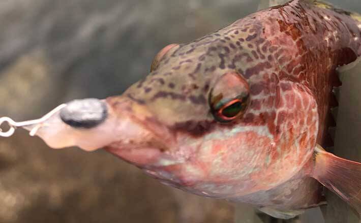 テトラ際をリトリーブすると魚が飛び出してきて面白いが、やはり根にいってしまったときのジグヘッドのロストはもったいない。そこでオープンウォーターに投げてレンジを入れてみると、良型キュウセンがきた。