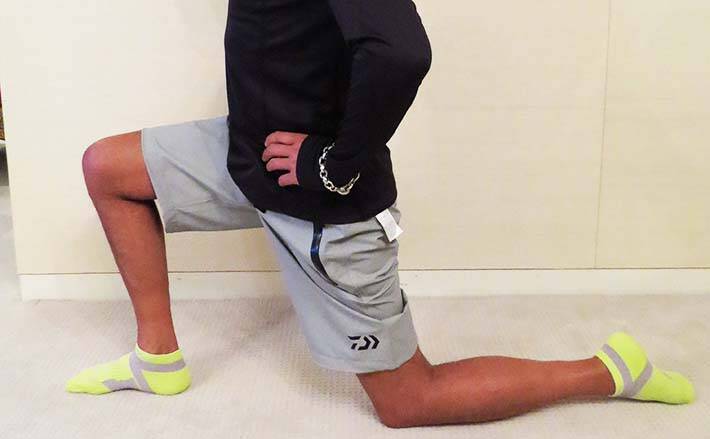 ストレッチは広範囲に、マッサージは局所的に働きます。単独で行っても良いですが組み合わせるとより効果的。同じエリアにアプローチするならマッサージ→ストレッチの順が原則。マッサージで血流を促し、筋肉を柔らかくした後ストレッチするのです。(ウエア:DaiwaロングスリーブシャツDE-8205 オーシャンハーフパンツDR-6205P PU)