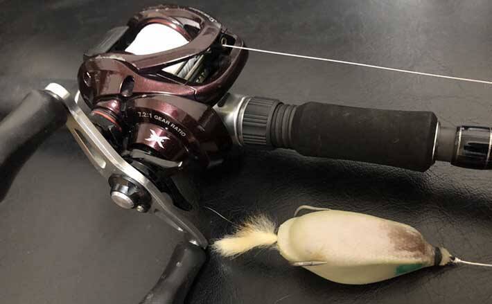 フロッグでフロロ・ナイロンラインを使うとフッキングの際に伸びてしまいアワセが決まりにくくなってしまいます。さらにPEラインは水に浮く性質があるのでトップウォーターでの釣りになるフロッグではPEラインの使用がマストです。