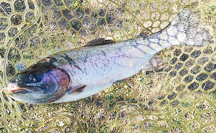 親子の連携でニジマス手中!
