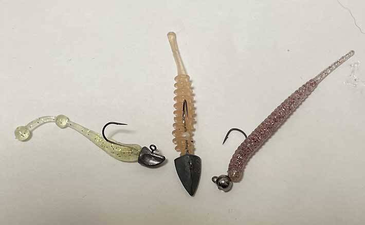 巻きの釣りでは、ナマリ部分がラウンド型で水の受け流しがいいものを使う。合わせるワームは、一般にメバルは波動を嫌うといわれるので、ピンテールが無難だろう。その場の条件にもよるが、ジグヘッド1g程度に1.5inch前後のワームのサイズがスタンダードとなる。