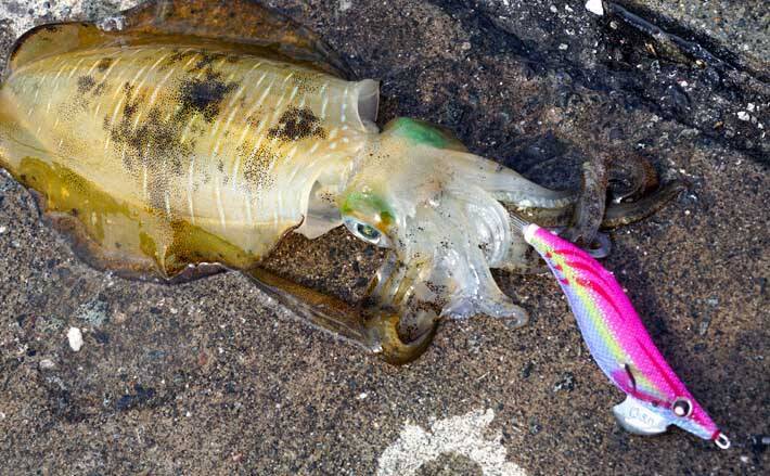 アオリイカの引きは「ジュッ!ジュッ!」とジェット噴射するような手応えがある。取り込みは足1本のみハリ掛かりしていることもあるので、タモや専用のギャフを使用する。