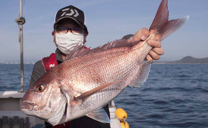 仕掛けを流し始めて2投目から、ポツポツとマダイが上がったが、40cm前後と型がイマイチ。ここ鷹巣沖は大型マダイのメッカ。ぜいたくを言ってはいけないが、70cmいや、それ以上の大型に夢が膨らんでしまうのは自然なことなのだ。