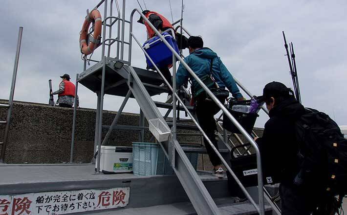 船と波止との間を移り渡る際の足元はフラットではなく、船首のゴムタイヤやはしごになるので、キャリーカーは使いづらい。特に沖波止初心者にとって関門とも言える船首のはしごの上り下り、移り渡りの際は、手摺りをつかみながら移動しないと危険なので、キャリーカーの使用は避けたほうがいい。