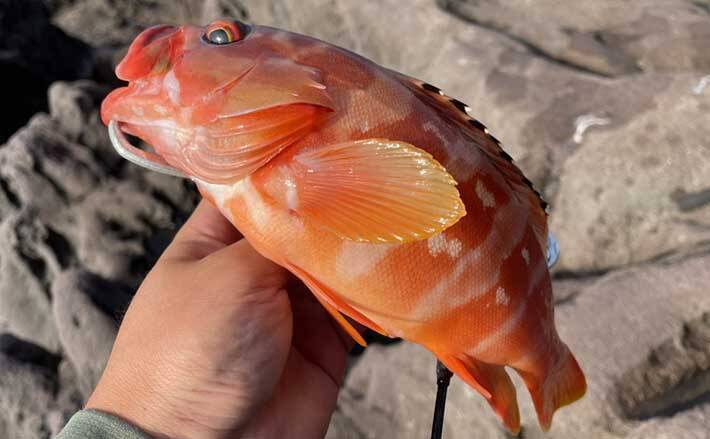 アカハタ狙いに切りかえるも反応が遠のいた。よりタイトに根の起伏に合わせてリグを操作すると何度かあたりがあり、ようやく小型のアカハタを追加できた。その後カサゴを数匹キャッチし、納竿とした。