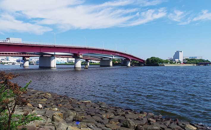 勝島橋のたもとから続くしおじ磯はスロープなどが新設されさらに釣りやすくなっている。対岸は大井競馬場で駅からのアクセスは良好。