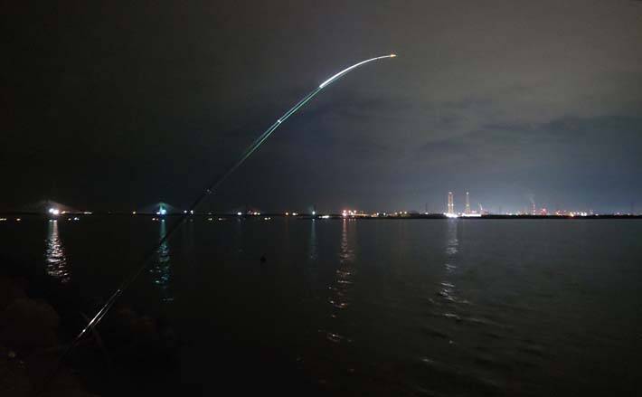 午後7時を過ぎて下げ潮に変わると、濁りが混じって流れが速くなった。なんとか2匹目のウナギを求めて粘ったが、25号のスパイクオモリも流される状況となったため10時に納竿とした。