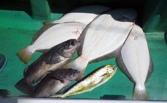 最終釣果はヒラメ4匹(1.3~3.9kg)、ソイ2匹(マゾイとクロソイ)、シイラ1匹。
