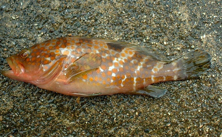 キジハタは、沿岸の浅いところに生息する、小型のハタの一種。メスのキジにも例えられる鮮やかな斑点模様が和名の由来です。