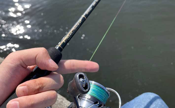 下の写真のように、まずメタルジグを投げたら、ジグが海中を落ちていくまで、指でスプールエッジに軽くテンションをかけながら、イトを送り込んでいきます。