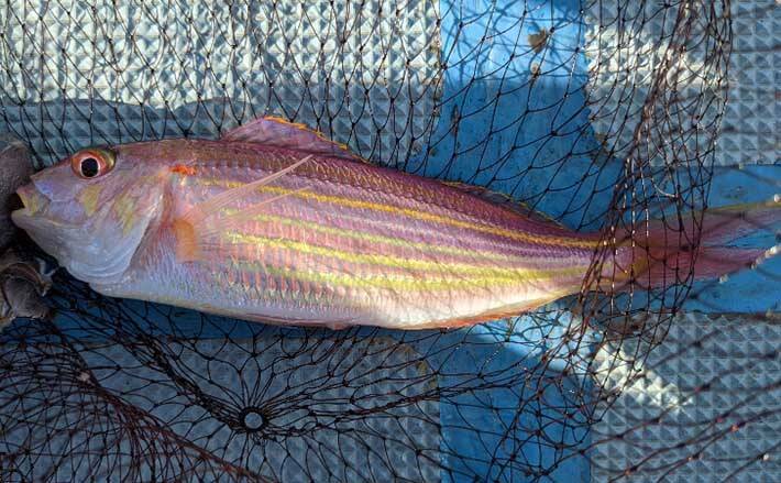 一方筆者のアマダイ仕掛けには一投目からアタリが訪れる。リールを巻き上げてくると水面に現れたのは良型のイトヨリ。慎重にタモで救ってGet!これでボウズは免れて一安心。しかし後が続かずこのポイントも諦めることにした。