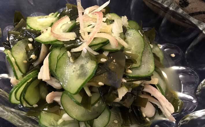 いつも乗船させていただいている釣り船で、よくお土産にいただくワカメで、筆者がたまに作っているのがワカメときゅうりの酢の物です。あるとき思い付きでヒラマサの胃袋を一緒に和えてみたところベストマッチだったので、リピートするようになりました。