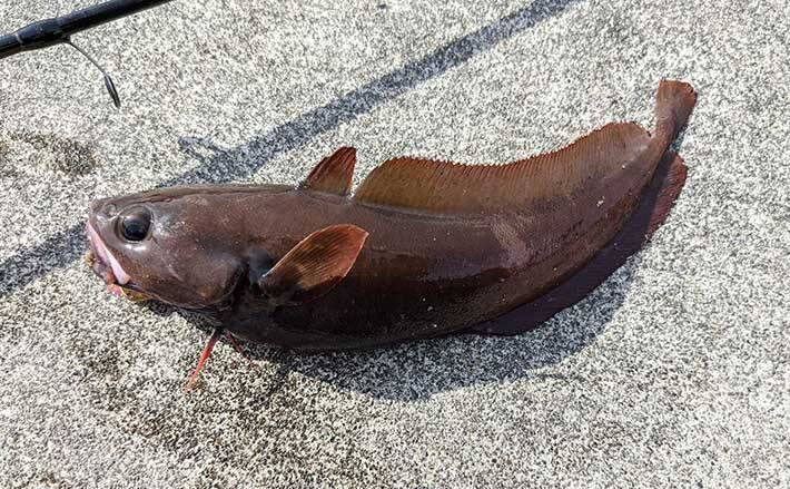潮の影響もありますがこの日は穴の奥深くにブラーを落とさないとなかなかアタリを貰えませんでした。時刻は既にお昼過ぎ、14時前にようやく力強いアタリをとり巻き上げるとアイナメ……?いや、多分これはアイナメそっくりのクジメでしょう。何はともあれ1尾釣れました。