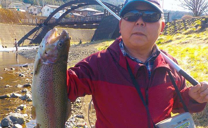 いい感じになってきた15時半、「きたあー」との声に振り向くと瀬口さんの竿が満月。ヤマメ狙いだったためハリスはナイロンライン0.3号。慎重にやりとりしたため10分くらいかかっただろうか、ネットに納めたのは60cmのニジマス。エサはイクラで、瀬口さんは満面の笑顔。
