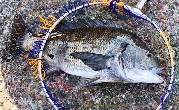 しばらく続けていると、寝ウキが立ち上がり消し込む。マダイとは違う引きで、手前のケーソンに突っ込まれないようにやりとりして50cm級クロダイ。
