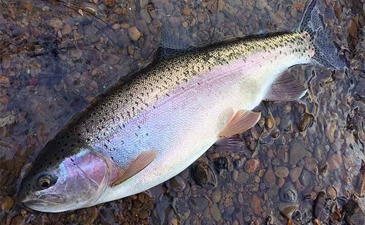 その少し上流の深場で、グレーのマイクロゾンカーにガツンと重量級のアタリ。アタリと同時に水面に水しぶきが弾け飛ぶ。当日の私のタックルは6番。流れに乗って走られる前に、強引に引き寄せる。3分ほどかかったが、陸に引き上げて無事にキャッチ。60cmに少し足りない丸々と太ったニジマスだった。