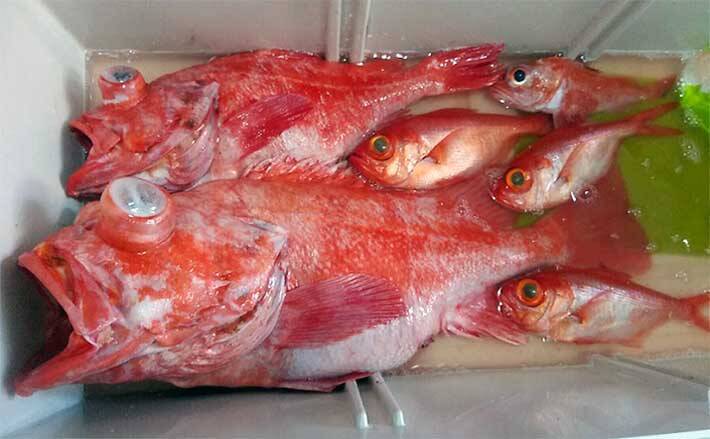 写真では小さく見えるキンメですが、メヌケとクーラーボックスが大きすぎるだけで、実際は26~30cmとまずまずのサイズ。メヌケとともに良いお土産になりました。