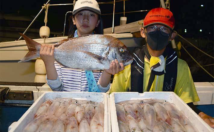 7月16日、北九州市・小倉港の太陽丸が小倉沖~響灘の夜焚きイカ釣りに出船すると、この日は大中小型ヤリイカを胴突きで1人20~40尾キープ。釣行したアコちゃんはイカ泳がせにも挑戦し、マダイ4kgと2kgを釣り上げ、ノア君は手返し良くヤリイカを釣ってイカ箱2個を埋めてみせた。