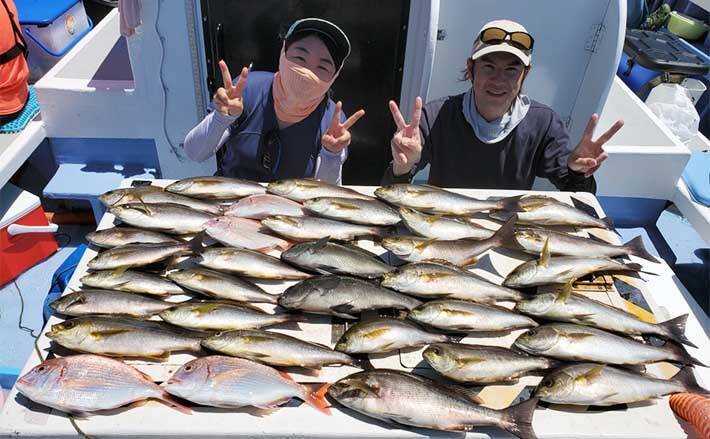 愛知県・南知多町の師崎漁港から出船しているすずえい丸では8月2日、大山沖のイサキ釣りで本命が好食い。30匹弱の釣果を得た人も。また、1日のキス乗合便も絶好調で、サオ頭は115匹をゲット。
