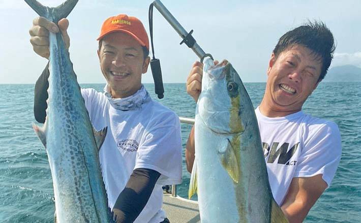 友人はまだやり取りをしていて、その様子から大物なのが分かる。やっと上がってきたのは本命ヒラマサ、それも良型だ。2人ともイワシのサイズに近いジグを使用したのが釣果に繋がったようだ。
