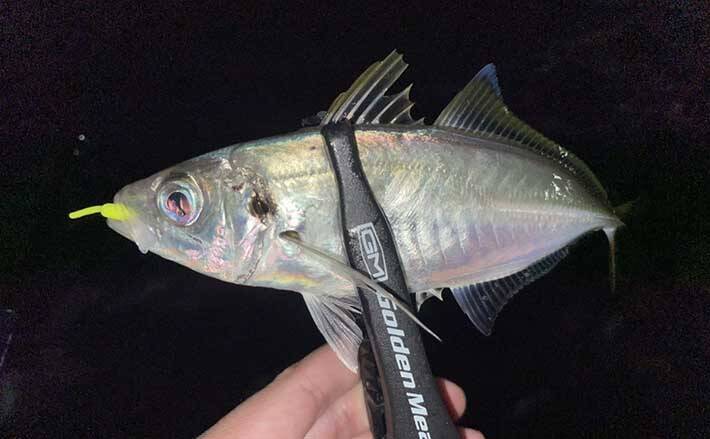 場所はよくある漁港の常夜灯の下。見える範囲には浮いているアジの群れも見える。