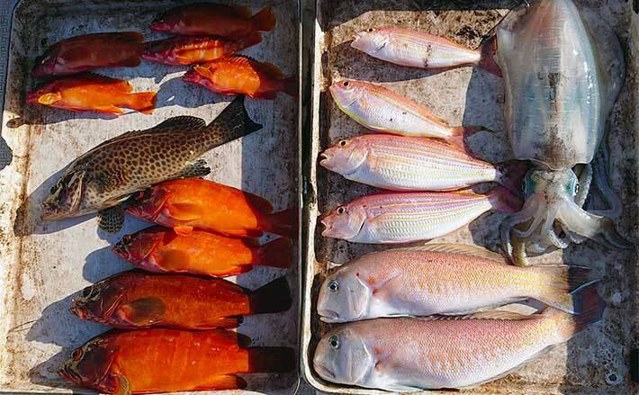 当日の船中釣果はアオリイカ、シロアマダイ、アカハタ、オオモンハタ、イトヨリなど当初の狙い通り、さまざまな顔ぶれがそろった好釣果となった。