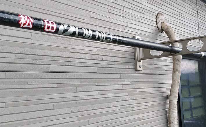 準備ができたら、サオの長さを調整する。とは言え、物干し竿を置く場所にセットしたサオを伸ばすだけ。伸び縮みする利点を活用するシンプルな方法だ。