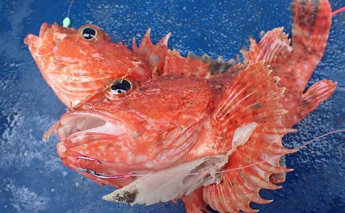 彼女をふと見ると電動リールを巻き始めている。「アタリあった?」と聞くと「何かコツン」ときたみたいと言っている。「マジか!?」と思いながらもやり取りを見ていると水面にダブルで何かが付いている。無事に取り込んだのは小型のオニカサゴとユメカサゴ(この時はオニカサゴとは気が付かず……)。エサを尋ねると生サバとのこと。