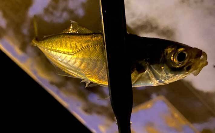 重さが1gのため、狙ったアクションは「スロー」だったのですが、逆の発想で、表層を速めのリトリーブで探ってみることにします。すると、「トン…」とアジの独特の吸い込みのアタリが。浮いて来たのは「アジ」です!ようやく出会えましたが、残念ながら小型のリリースサイズでした。その後は、反応もなくノーバイトでこの場に見切りをつけました。
