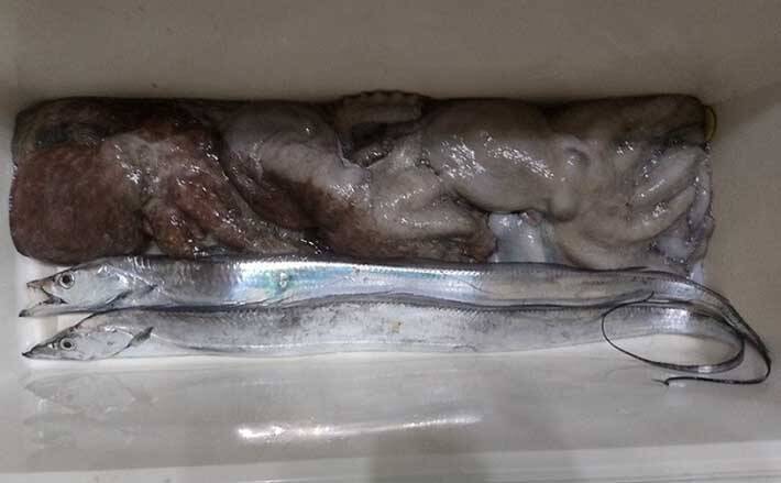 1.5~2kg(船長目測)のマダコ3匹、指4本のタチウオ2匹。「もっとタチウオを釣りたかった」が本音ですが、むしろこの状況では、最後の最後で、港前に群れが現れてくれたことがラッキーだったとも言えるでしょう。2匹いれば、炙り刺、塩焼き、骨せんべいを、1食分ですが4人家族で十分満喫できますからね。