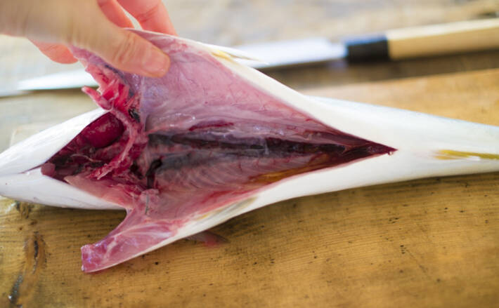苦玉は胆のうなので、肝臓と繋がっています。魚の場合、苦玉や肝臓は頭とエラの近くにあることが多く、苦玉を傷つけるパターンで多いのが、お腹を開く時の一太刀目と頭を落とす際の一太刀目です。