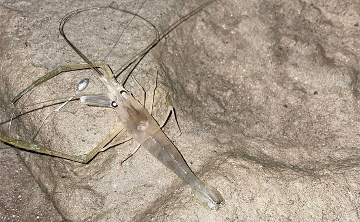 透明度が高いときや浅いところならライトではっきり見えるが、そうでない場合は目を見つけるのが良い。エビの目は、ライトに照らされると赤く反射するので見つけやすいはずだ。これはテナガエビのみならず小さなスジエビから大型のイセエビも同じだ。