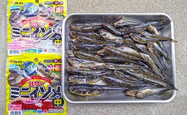 用意したエサは青イソメとマルキユーのパワーミニイソメ。パワーミニイソメはパワーイソメソフトと同じ素材を使用したミニタイプで、ハゼ狙いに使いやすい。常温保存が可能なので、常備しておけばいつでも使用可能だ。