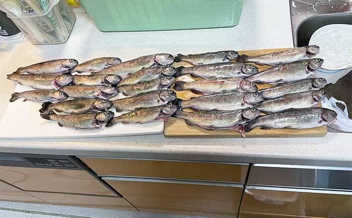 管理釣り場ということもあって、針が残っている個体も割と多い。先客がラインブレイクしたままの針が残っている個体もいくつか見られた。ワタを抜いただけでは針が残っていることも多々ある。誤食防止のため、針が残っている事が多いエラまで抜くことをオススメする。