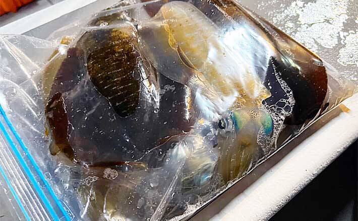 水抜きできない場合は、海で墨をはかせてから、優しく取り込み、低い位置から、海水が溜まった容器などに入れるとよいです。クーラーボックスにすぐ入れる方は、神経締めをした後に、専用の袋などに入れるか、墨抜きまでして入れるのも後の処理が、楽にできるためお勧めです。