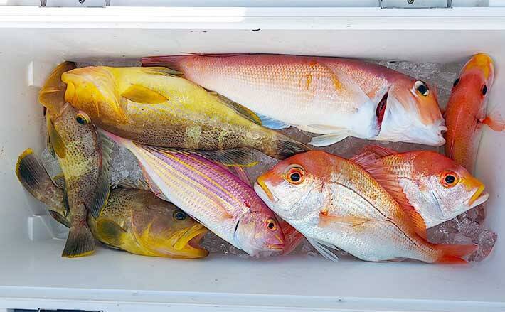 さて、当日は昼過ぎから風が強くなる可能性があったため朝イチに70mラインまで向かい、徐々に港に近づいていく予定で出船しました