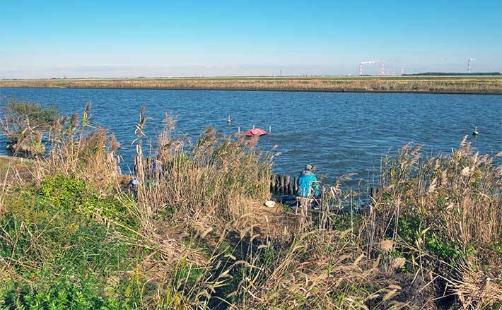 桁沼川の吐き出しから約800m下流へ進むと、護岸から2mほどの沖側に木製の波よけ杭が現れ、これが菰敷橋まで続く。ポイントはこの周辺で、とくに4つある赤い屋根の水車周辺は水が動くので人気がある。水深は深い所(水車周辺がとくに深い)で3~4本で、水車から離れると2本半前後。