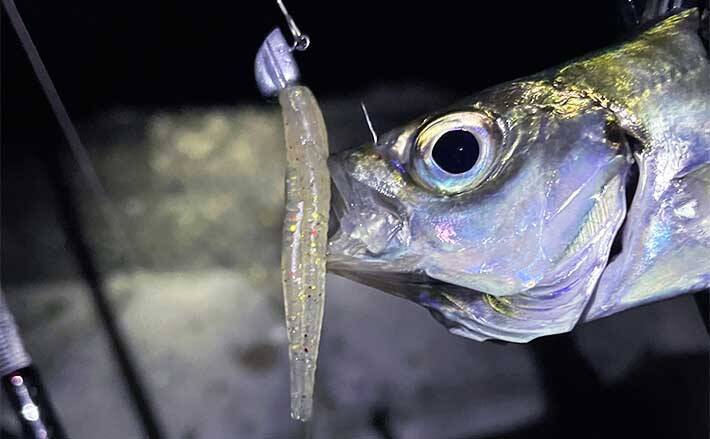 まずはメバリングロッドから。開始数投でアジの棚をサーチ。1gのタングステンジグヘッドに2inchのワームで、カウント10のレンジに群れを発見した。もう少しワームをサイズダウンして、開始3分ほどで1尾。