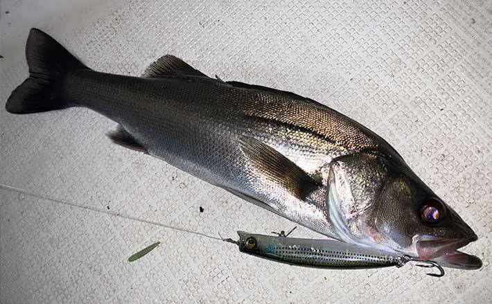 タックルをシーバス用の少し強めのものにチェンジ。ルアーはブルーブルーのブローウィン80Sのチャートバックパールだ。バースの橋脚際にキャストし、ミディアムスピードで引いてくると手元に魚の重みが乗ってヒット。橋脚に巻かれないように注意しながらファイトし、ネットに収めたのは45cmほどのシーバスだった。