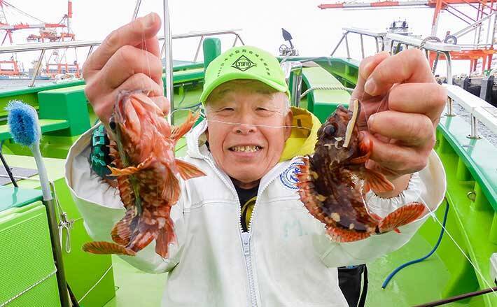 この間、船中でも次つぎとアタリがでて、14~18cm主体に取り込まれる。星名さんは一荷を含め入れ食い状態。トモ2番の林さんは、仕掛けを投げやすいスピニングタックルで広範囲を攻め、20cm級カサゴをキャッチ。