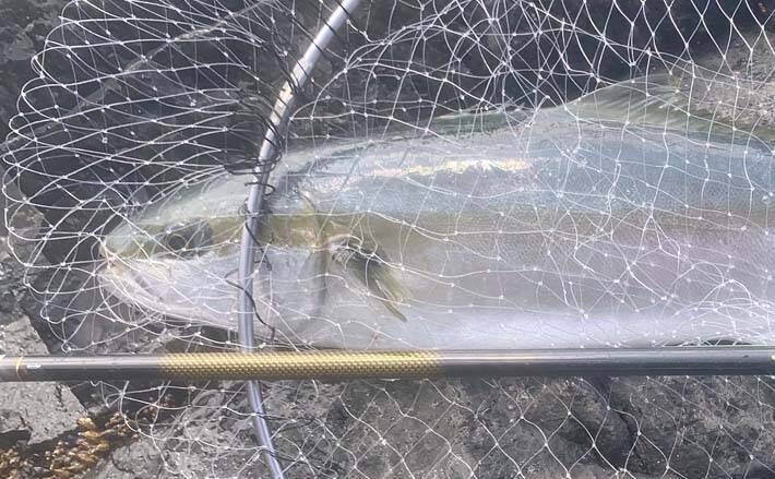 これがうまくいったのか瀬ギワにも底にも走らず段々と弱まってくるまで切られずにキープできた。じわじわと沖から寄せることができ足元にウキが見えギラリと魚体が海面下に鈍く光る。