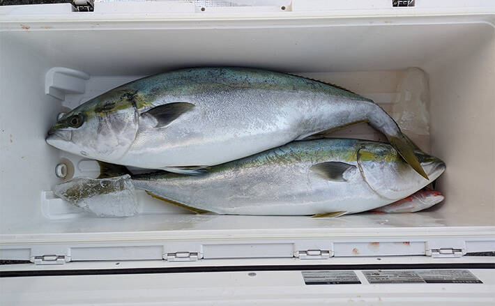 ベイトのマイワシ2匹を咥えたままの食いしん坊なブリだった。