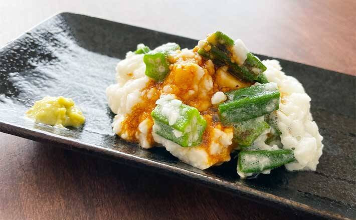 オクラは塩茹でして輪切りにします。長芋は皮を剥いて擦り漕ぎ棒などで叩き潰し、荒めのとろろ状にします。