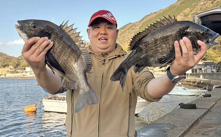 しばらく打ち返していると、エサ取りとは違うアタリ。軽くアワせると沖に向かって走る。なかなかの引きを楽しんだあと、無事タモ入れしたのは45cmクロダイ。