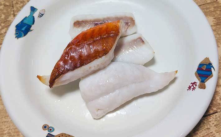 干したあとはグリルなどで軽く焼けばできあがり。皮があるほうと、ない分を食べ比べてみよう。