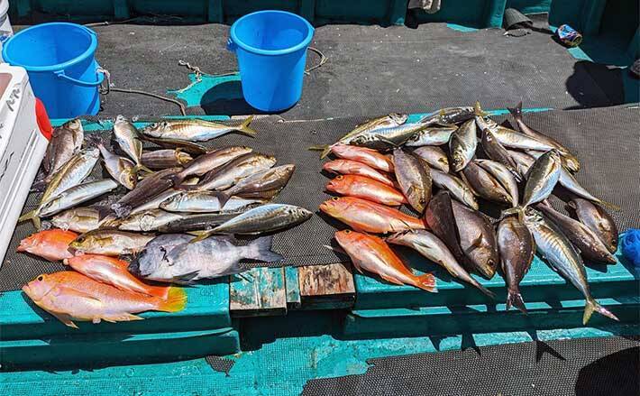 続いてSさんは口太40cmを仕留め、流石は磯釣師です。Nさんは、釣りすぎを感じたのかトモのご夫婦にレクチャーに行っていましたよ、余裕ですな。まだまだ釣れる感じでしたが、良丸船長は色んな魚を釣らせたくてたまらないようですわ……(笑)。