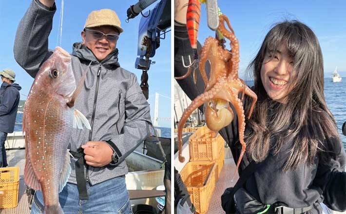 兵庫県淡路市にある育波漁港出船のエビス丸では5月26日、マダイとマダコを狙った欲張り2目釣りで出船。50cm級のマダイや良型のアジ、もちろんマダコもゲット。また、13日の釣行ではマダコがよく釣れ、いい人は20匹超の釣果。