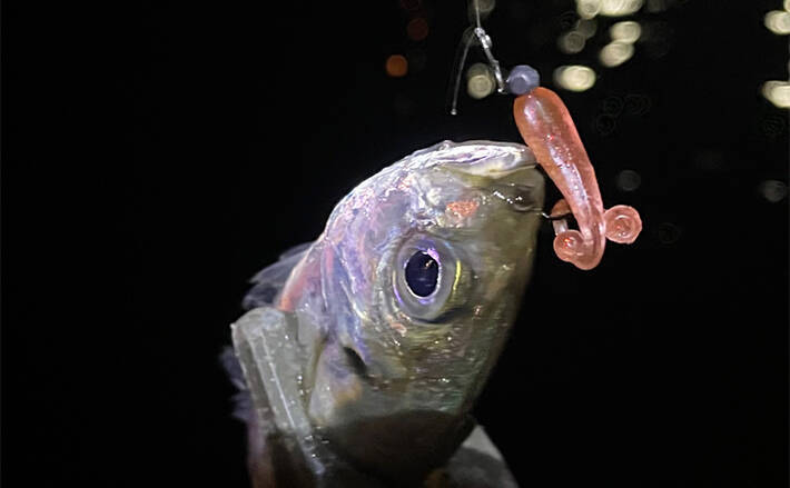 プランクトンパターンの魚には、ワームの色が、ある程度かたまったプランクトンの色に見えているらしい。それがすとんと縦に落ちるか、横に漂うかする動きがきっかけとなってバクッと食いついてくるのだ。ナチュラルなクワセでは、クリア系がやはり魚を騙しやすい。